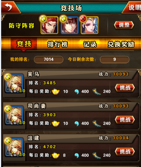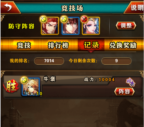 竞技场里的记录会记录着关于自己的竞技场挑战记录,挑战别人和被别人挑战都会显示在里,被击败了没事,看看他的阵容,想出一套防守阵型。