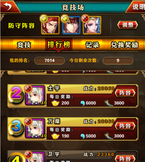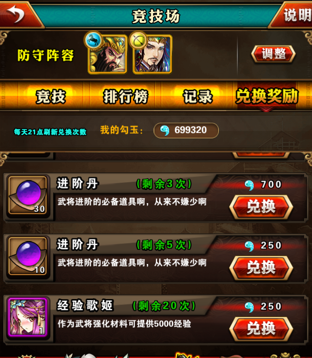 竞技场兑换奖励可是最重要了,勾玉可以在竞技场里兑换超多道具,而且还有我最喜欢的进阶丹,还有经验武将,甚至还有五星装备和顶级五星武将可以兑换。