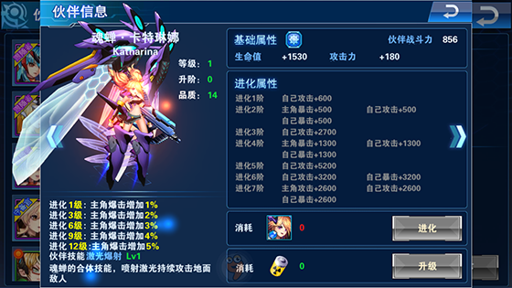 “魂蝉♦卡特琳娜”听名字就高大上,全身以紫兰色风格为着色,其如蝉翼般的翅膀极为显眼,这个伙伴属于冷色系派别,冰冷的神色为其在战斗中披上一层无可攻破的薄膜,更显得其女王范风格,在这个伙伴身上看不到任何的稚嫩气息,更甚的是其内心火热般的激情与向往,天生为战斗而生,这个伙伴属于“专精型”伙伴,具有穿透激光攻击,能对空对地以及高爆高攻的能力,并且其独伙伴技能为“激光爆射”,合体技能为喷射激光持续攻击地面敌人。然而在这个独具女王范的伙伴身上,那些技能则稍显得黯然失色,其独特气质掩盖了一切气息,所迸发出的只有无限战斗力,拥有它将是您的一大助力!