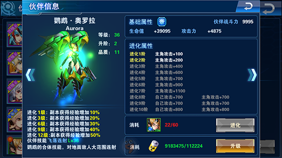 “鹦鹉♦奥罗拉”整体色彩风格以绿色为主,兼具流行时尚元素,这个伙伴设计灵感来源于高级物种-“鹦鹉”,是一种羽毛艳丽、爱叫的鸟,也是唯一一种可以学人类语言的生物,冠以美丽的羽毛著称,在鸟类中是比较独特的存在。我们的“鹦鹉-奥罗拉”继承了这一华贵而高雅的气质,整体流线型设计风格,显得更加生动自然而又不失霸气。“鹦鹉-奥罗拉”属于基础型伙伴,能力平均,对空对地能力,伙伴技能为“飞落射击”,合体技能对地面敌人大范围连射。不过这个小伙伴在所有伙伴中是潜力比较大的哦,后期的投资带来的回报无法想象,总而言之拥有它就相当于拥有了一个实力与潜力无限的一大助力!