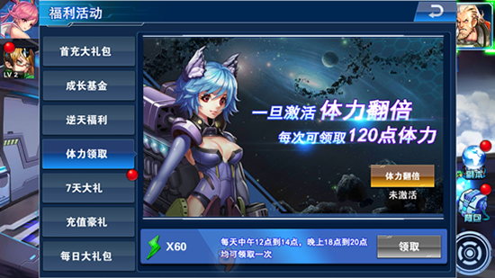 首先就是每日中午和晚上的吃,吃,吃大大餐,吃到饱哦,这是我们《星际无双》中的一个精彩的活动哦,刚好是中午的午餐时间和晚上的晚餐时间,大家在吃午饭和晚饭的同时,也别忘了给我们的角色补充能量啊,千万不能错过升时间段哦,不然又得等好几个钟啦,而且每次吃大餐获得的体力是60点体力,一天就是120咯,如果激活体力翻倍,则每次都可领取120体力,一天就可以领240体力啦,还怕因为体力而不能好好的玩耍吗,那就中午12点-14点和晚上18点-20点准时来领取体力吧。这比系统自动恢复要来的快了,所以各位小伙伴们一定要记得吃大餐时间哦!