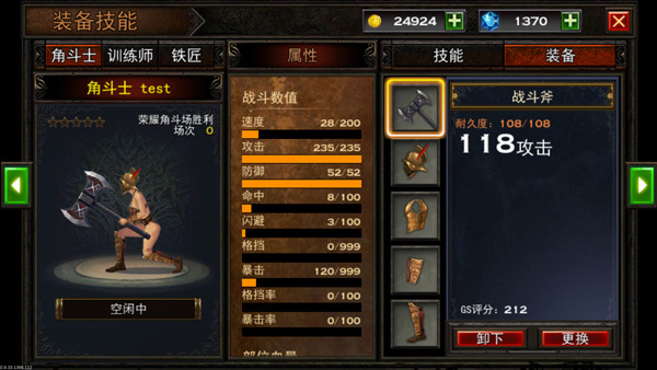 除了穿装备,角斗士自己也是会成长的,通过训练可以让角斗士自行进行训练,等一段时间后,角斗士将会随机的增加属性。当拥有角斗士训练师后,角斗士的训练效率将会大幅提高,训练师的品质越好,效率提高越大哦~