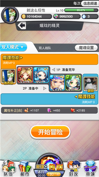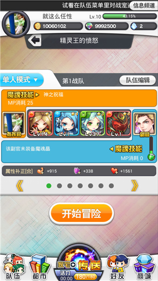 战队组成:每个队伍最多可以上阵4名幻神,和一名缔结契约的魔导士分身来协助战斗。被契约的魔导士分身即为副官,在幻神攻击BOSS的时候,和指挥官一样可累积MP能量,MP能量槽满时,可释放大招,痛击敌军!玩家点击空位即可选择上下阵幻神,左右切换可编辑更多队伍。