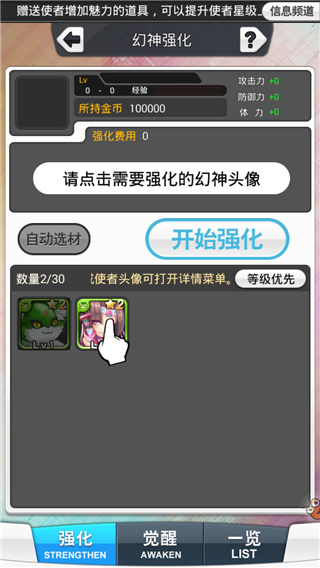 1. 在“队伍”中打开,选择“幻神成长”选择需要强化的幻神,可手动自动选择强化材料,点击“开始强化”就完成了。