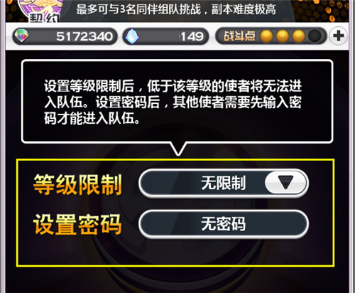 选择好模式后,选择下一步,可对队伍进行等级的限制、密码设置以及是否允许中途参加。