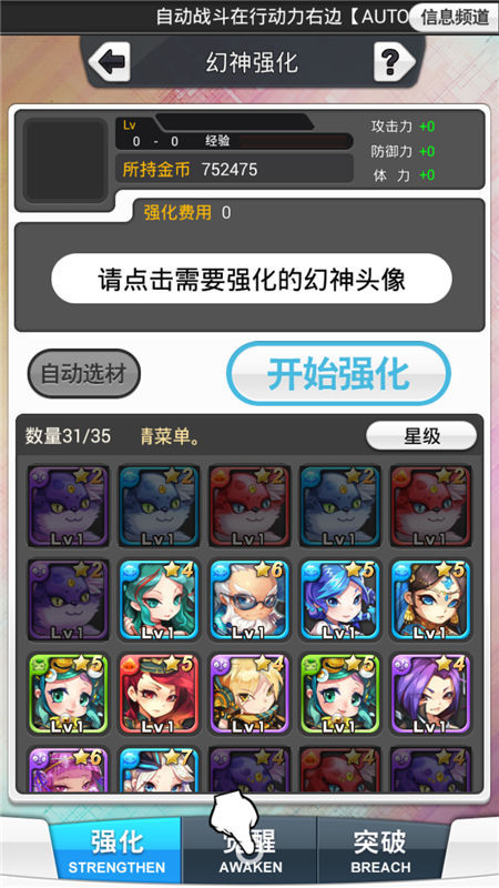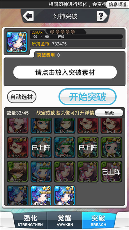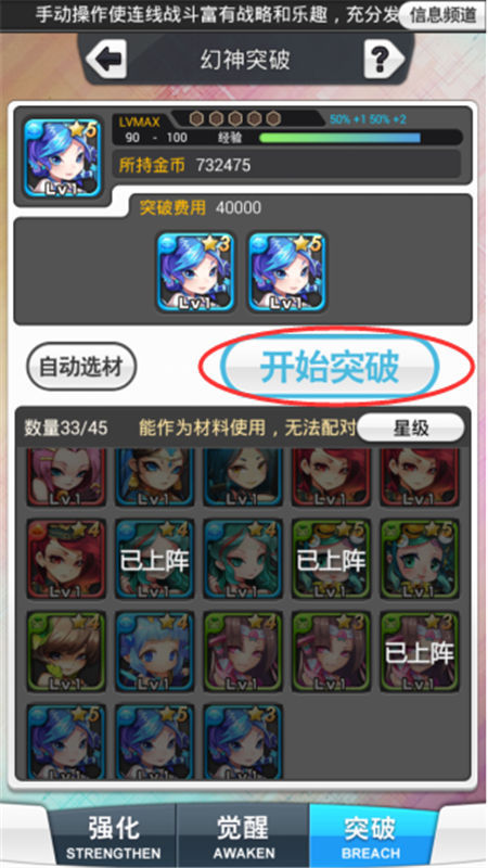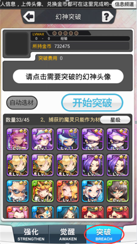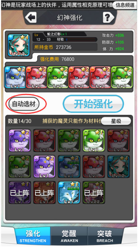 3.选择所需的突破素材觉得麻烦可以按“自动选材”系统会自动为你匹配幻神