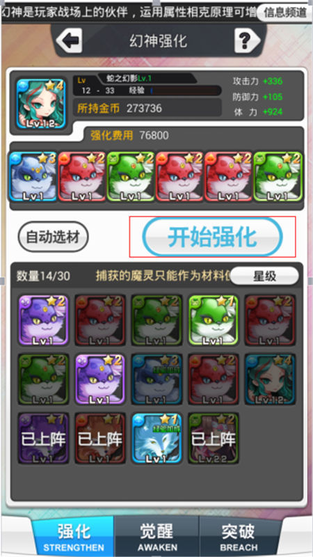 5.材料选择完毕后,就可以点击“开始强化”,强化幻神