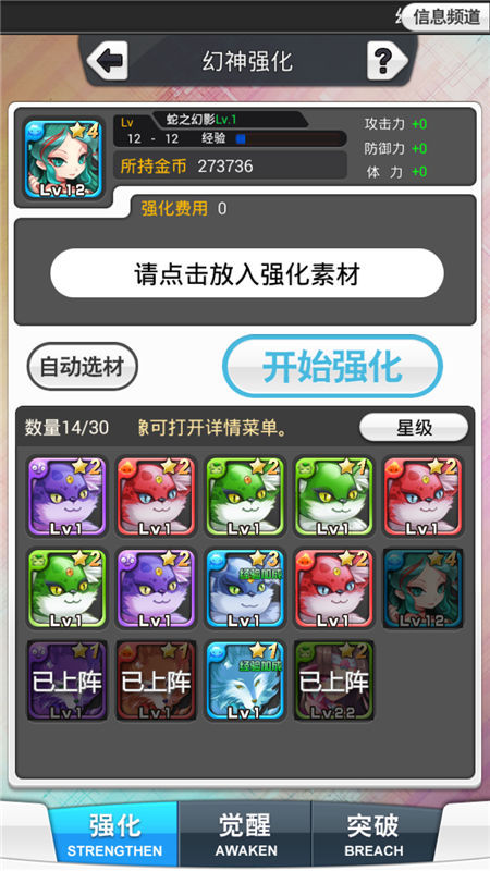 4.点击下方的强化素材,我们可以看到“强化费用”会发生变化,怕麻烦的用户可以选择“自动选材”这样系统就会优先选出最适合当前幻神的强化素材,不过需要注意的是,同属性的强化素材和幻神,强化增加的经验更多哦!