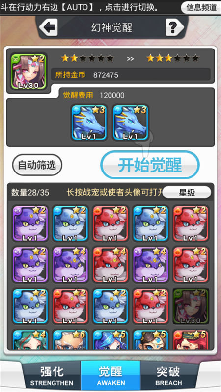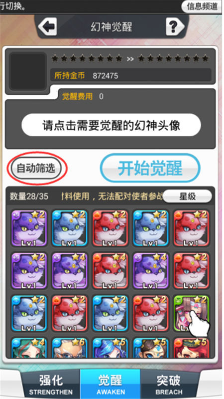 2.选择需要觉醒的幻神,如果觉得麻烦可以按“自动筛选”系统会自动为你匹配幻神和材料哦,若还没有获得所需材料,请看下方“觉醒素材“获得。