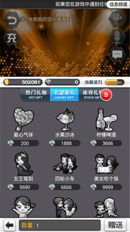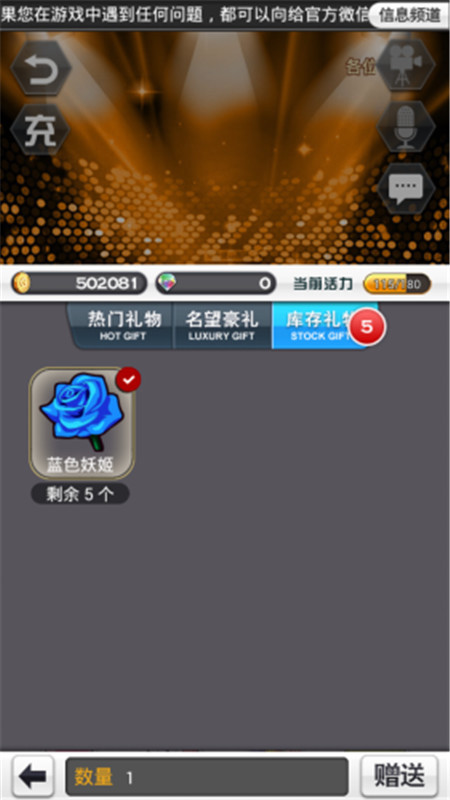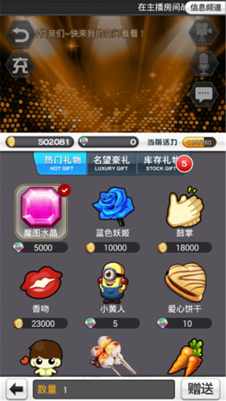 热门礼物直接用金币和钻石就可以购买并赠送了呢,确认礼物数量,点击赠送就可以送出礼物了。