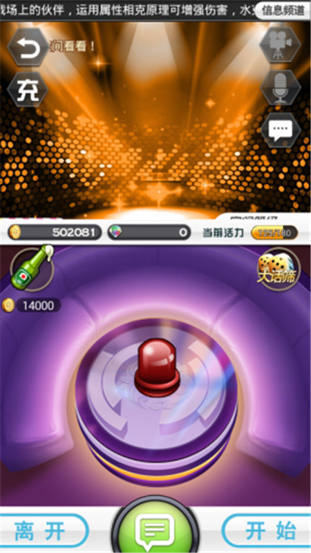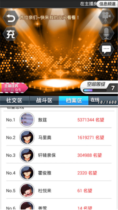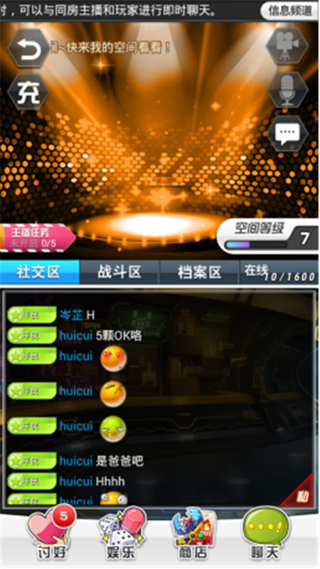 直播间上半屏幕为社交区,战斗区,档案区和在线人数显示,下面分为讨好,娱乐,商店和聊天。
