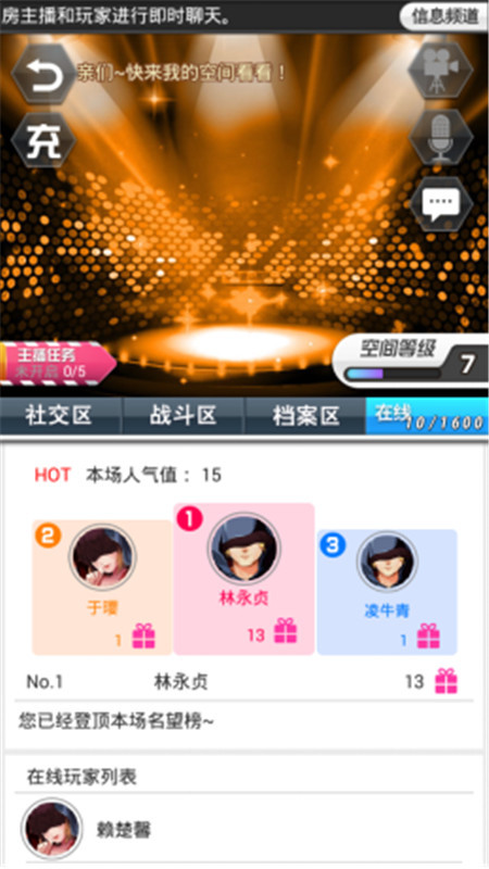 玩家可以在这里可以看到该房间内所有玩家及主播的公开聊天。