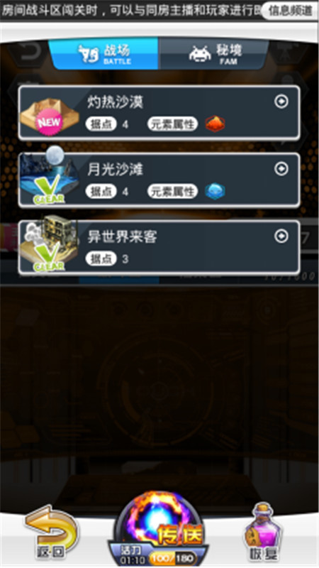 团战是在直播室内发起的,可支援4名玩家同时游玩,团战需要玩家在指定时间为完成战斗中的任务,任务可能是击杀某个BOSS或者清除多个目标。在执行任务时需要互相配合,安排各自进攻的路线,开启机关或者寻找BOSS。团战都还提供各种补给用品帮助过关。当然使用物品需要一定的空间积分哦~