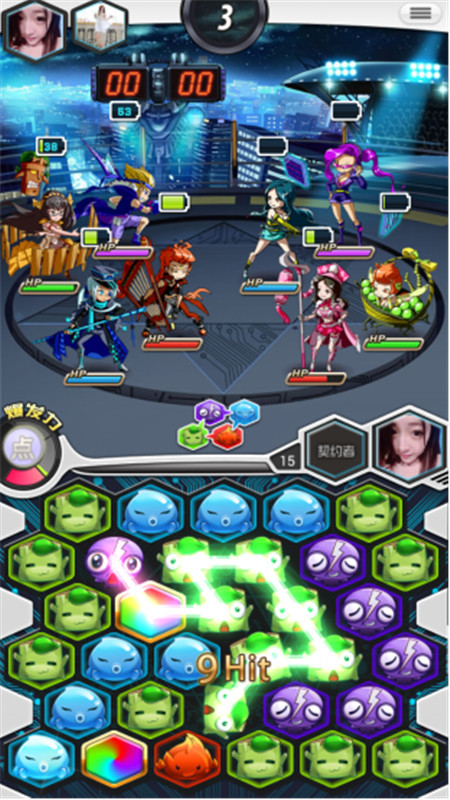6.选择完成后,就进入了战斗界面,战斗消除采用回合制度,在消除攻击元素的同时也要想方设法破坏对方消除的脚步, 看准时机使用“爆发力”可连续消除,一举击败对方。
