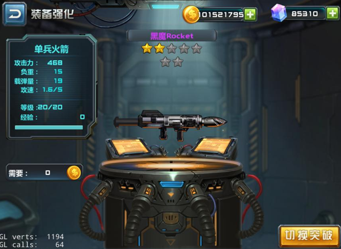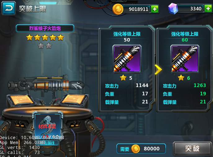 l 显示突破成功后的装备信息——星数、攻击力、载弹量、攻速、负重