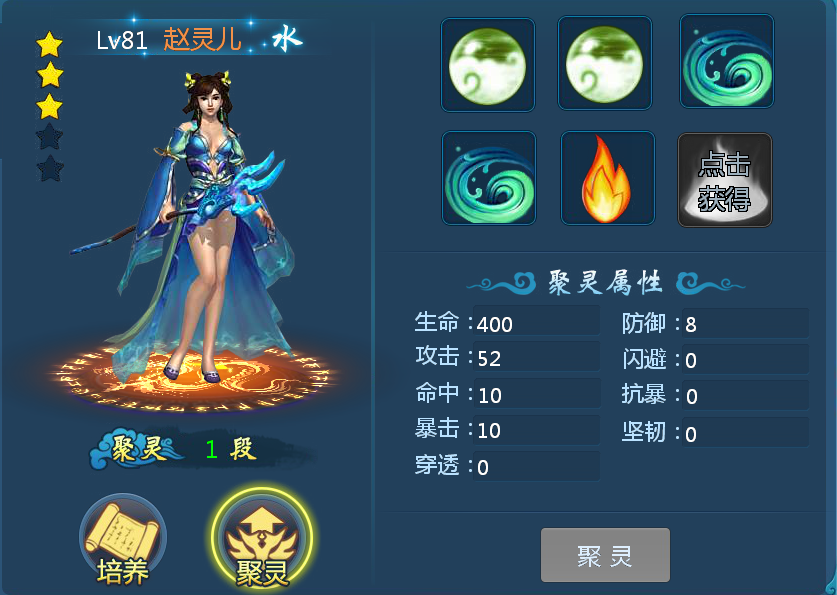 1、每个师妹聚灵都有10段,通过搜集相应的材料进行聚灵提升段数,段数越高属性越强。