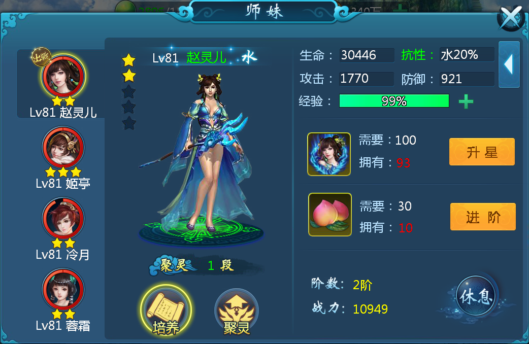 2、升星:使用对应师妹的元神,可以提升师妹的星级,升级可以大大提高师妹的能力。