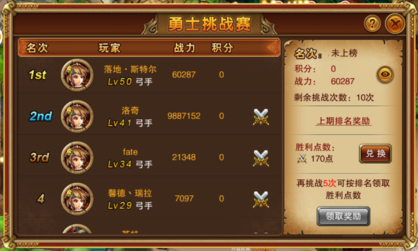 在勇士挑战赛可以查看当前服务器中玩家的竞技积分排名,并不断挑战他们,获得无上荣耀和丰厚的奖励。
