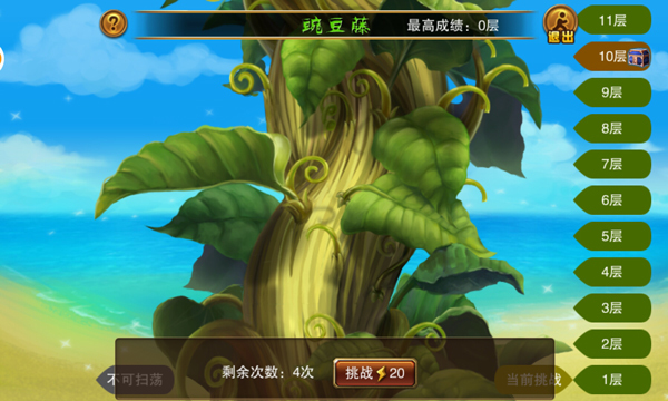 豌豆藤25级开启,每天可以挑战2次。玩家将不断地前行挑战各种敌人,每战胜一波敌人,玩家都将获得丰厚奖励,每成功挑战10层可额外有机会获得对应层数的巨人宝箱一个。