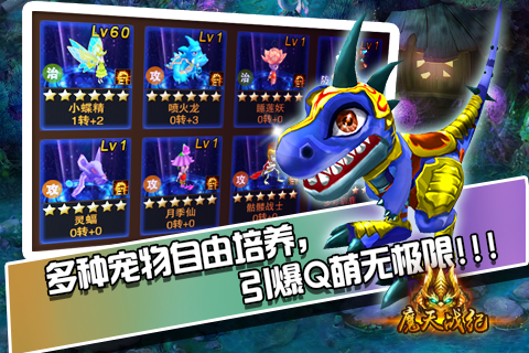 宠物分1星到6星,游戏内的副本等活动会产出,也可用钻石抽奖。宠物有攻击、防御、治疗三种类型。每个玩家可上阵三只宠物,上阵后,宠物属性可通过阵法转移给主人。同时只能让一只宠物出战辅助战斗,宠物的能力不可小觑。