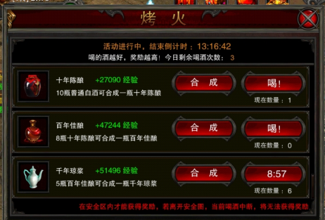 想要进行挂机烤火,必须先要准备一瓶白酒后,才能使用烤火点,每瓶白酒会增加烤火时间上限,让你有更长时间来进行烤火。