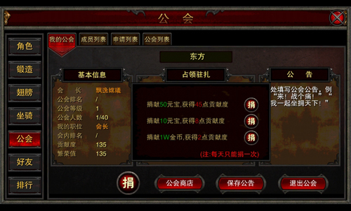 公会在创建后,每天可进行一次捐献,根据捐献力度,将会增加公会繁荣度,繁荣度越高,公会等级也就越高,公会每提升1级后,即可额外获得5个公会成员名额,让公会越来越强大!