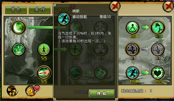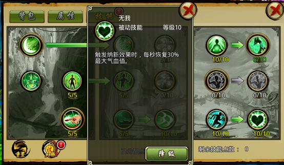无我,配合纳新,恐怖程度不用说了吧,加满后这个效果和无敌时间一样持续三秒,如果加满,意味着你要死的时候,蹭的一下,满、满、满血了……配合药品在打boss的时候,可以变成不死鸟!不过基于实战中的操作,多少有些出入(比如一些异常状态,回血的debuff,导致你回不满血),这个10个技能点是否要全部点满,看情况而选择。