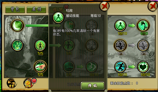 再点吐故,看解释——每三秒100几率清除一个有害状态,这个在打怪和PK也是挺有用的,中肯的技能吧。