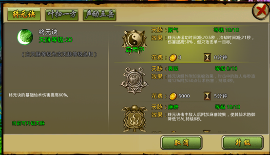 天脉的三个效果只能启用一个,是比较灵活的,但是!记住,刷怪和PK都不要群怪,因为你本身就十分的脆弱,强烈建议不要群怪。所以终元诀的天脉直接选第一个:聚气。理由是,不用读条了啊,减少冷却啊,提升伤害,单体攻击啊,PK刷怪都可以啊。关键是咱不群怪!