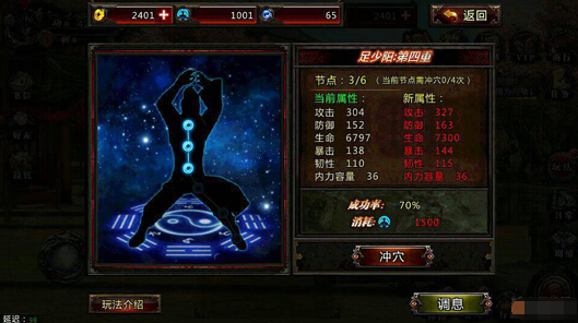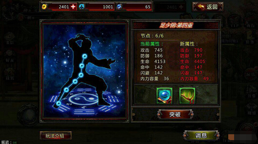 经脉十级开启,每隔十级开启一条新的经脉经脉使用内力冲关,内力可以在在调息里面使用铜币和修为获得。(铜币可在游戏副本掉落,而修为现阶段只有三个出处:过关斩将,日常修为关,比武场竞技场积分兑换)分为普通调息和高级调息。高级调息需要使用元宝,每天有一次免费高级调息的机会,高级调息一般会比普通调息多50%。每次调息每次数量不一,着经脉等级慢慢增加,内力容量和每次调息获得的内力也会增加,作为原材料的铜币和修为也会依次增加!经脉突破节点会需要进阶突破,经脉前两重进阶需要洗髓丹来突破,后期则需要洗髓丹加鹿茸。洗髓丹,鹿茸在商城皆有卖。也可通过竞技场积分换取。