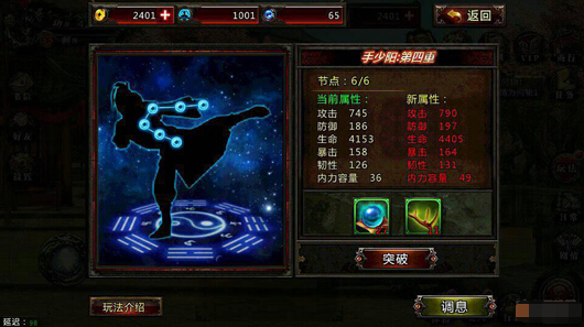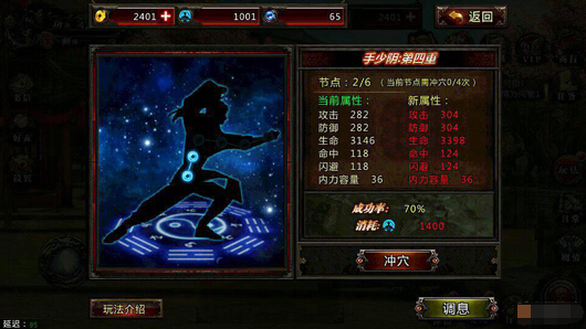介绍了这么多,那前期到底怎样升级经脉才合理?我个人的建议是,经脉前期(五十级前)全部升级到四重。四重以后再慢慢攒内力突破。为什么这样做呢,看图,前期,全部升到四重的话,战力提升的已经很多了,而此时经脉突破需要的内力量越来越大,不如攒着内力升级五十级开的全新经脉。如果你现在的内力真的很多,也不妨升级一下经脉。五十级前推荐主要升级手少阳经脉。如图所示,手少阳加的战力是最多的。五十级后可以主升手少阳,足少阴经脉。(五十级后的任督二脉,因为本次测试时间较短,未能到达六十级打通任督二脉。所以不能为大家分享打通任督二脉的绝世高手的心得啦)。经脉突破是有成功率的,要是一直点着全部失败的话。可以试着换另一条经脉突破,成功了再切换回来。要是都不成功的话,建议重登游戏。