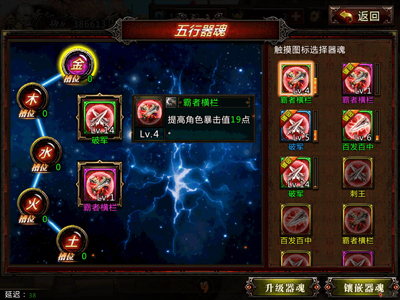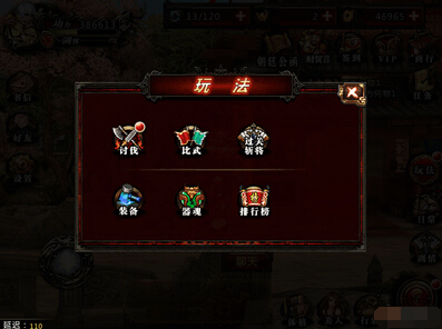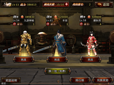 玩法分为讨伐,比武,过关斩将,装备,器魂,排行榜讨伐