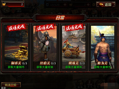 日常分为铜币,经验,明珠,修为,每个每日可挑战3次,失败不会扣次数,这个也是资源的一个来源,虽然不是很多,但是对于前期帮助很大,而且挑战不需要消耗任何资源,所以每日必须要做!玩法