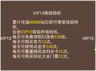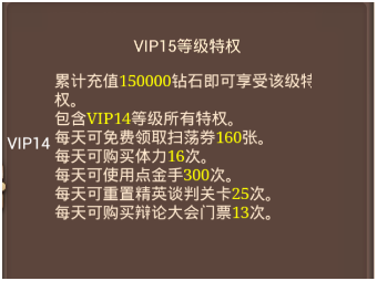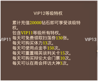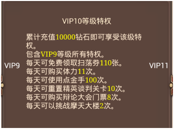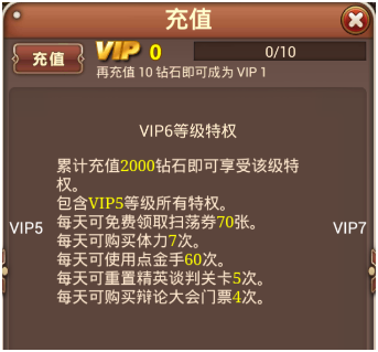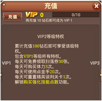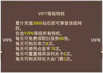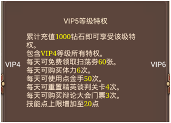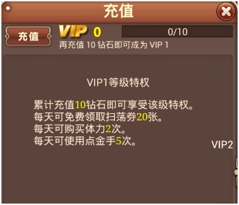 VIP1的等级特权的每天20张扫荡券和购买2次体力都是对升级有很大帮助的。