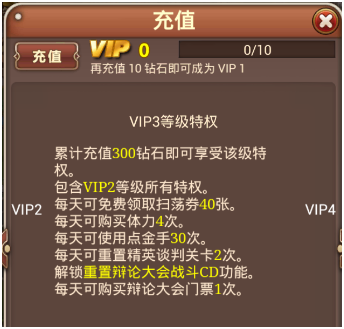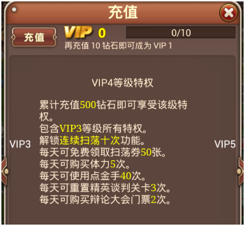 VIP4对玩家升级时间会大大缩短,亮点是解锁连续扫荡10次功能。