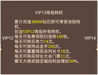 VIP13尊贵身份走在哪儿都给“面子”给您。您每一天摩天大楼的宝箱战力品,给您面子增加百分之五十。