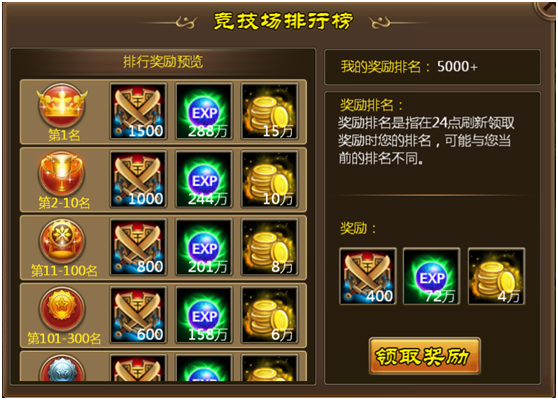 参与奖励:竞技场每一场比赛,胜利会获得丰厚的奖励,失败也有一部分的经验和荣誉。