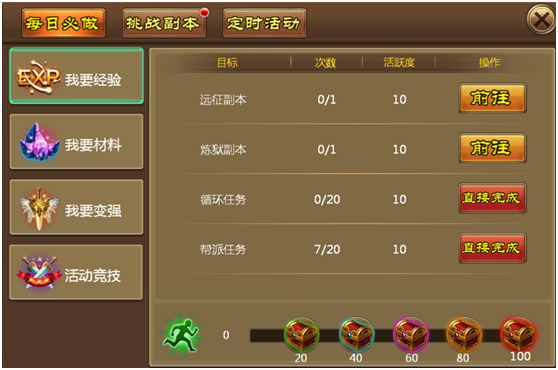 1、活跃度界面右侧列出增加活跃度的所有项目,以及可完成的次数、完成获得的活跃度。2、活跃度界面下方显示奖励,当达到活跃度条件后,手动点击【箱子图标】获得奖励。