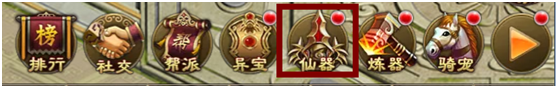 精灵系统也是通过主线任务开启,系统开启后玩家可点击主界面右下角三角按钮,然后点击“仙器”按钮进入。
