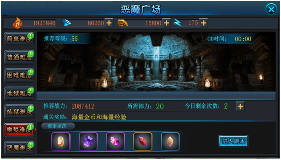 如下图所示,恶魔广场会对应人物等级开启,每日进入的次数有限,每进一次还有冷却CD,消耗的体力不少,与同等级的副本相比起来难度系数较高。
