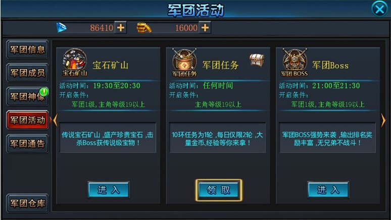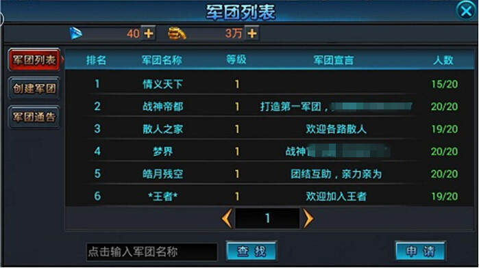 当玩家角色等级到达19级时,就能加入军团了。玩家可以选择喜欢的军团组织来进行加入,土豪当然是自己建一个啦,只需100钻石和50W金币,小意思而已。