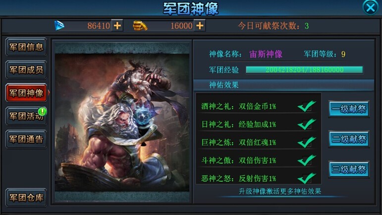 初级军团只能容纳20人,可以通过军团升级来增加人数上限,军团每提升1级,人数上限增加5人。军团可以通过累计献祭来进行升级,每日每人3次献祭的次数。