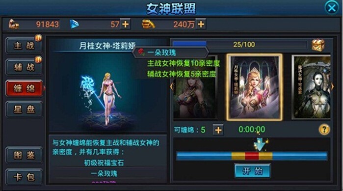 玩家人物角色和女神之间具有亲密度的关系,每次女神陪同出战就会消耗亲密度,当亲密度为0时,女神就不再陪同作战了。但是你也不需着急,你可以通过与女神“缠绵”或者给女神送花等办法逗女神开心,恢复女神的亲密度。同时也有几率获得其他奖励,如宝石、钻石、道具等。