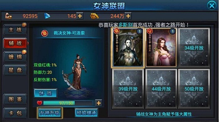 女神联盟系统中可以选择一个主战女神,和多个辅助女神出战。辅助女神虽然不能出战,但是可以增加角色的战力的,不同女神辅助的效果也是不同的,这里就卖个关子,让各位战神去探索吧!