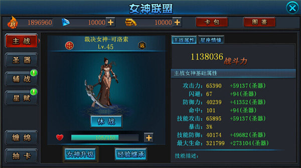 觉得一个人战斗太寂寞了么?培养女神啊!女神装备直接用金币培养,无需任何其他东西,当然了,强化前还是看看当前的强化成功率,低于50%就等等吧,有钱也不能任性啊,这坑可大了!前期只强化武器就好,一般情况下女神比你还是耐打多了!