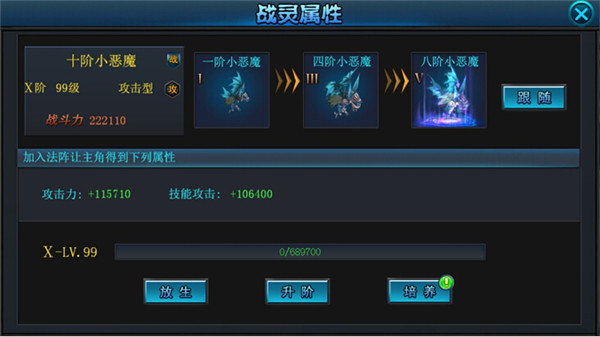 然后要培养战灵!没错,是战灵!3个不同种类的战灵都装备了,全都升到5级后就有了战神变身!这是通关副本BOSS的关键!几乎是双倍的属性状态!然后属性还不够牛X?还是被怪虐?继续培养战灵啊!1阶升2阶的战灵,属性提升杠杠的!投入绝对比+8 +9的钱要少多了,最多就1000钻,增加近1000攻击,武器顶天也就比+7加多100好吧!