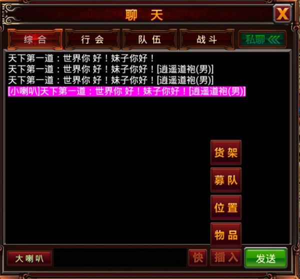 小喇叭频道:在该频道喊话内容会在聊天栏内粉底白字出现,不会消失,所有在线玩家均能看见,每次使用此频道需小喇叭道具一个。