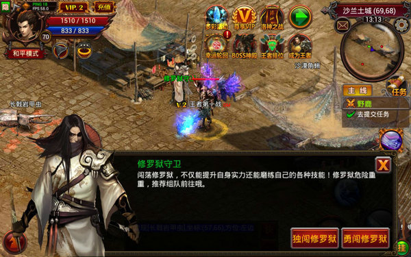 玩家可以通过游戏界面上方的多彩活动按钮,选择立即前往勇闯修罗狱活动,或直接来到沙兰土城(13,13)坐标附近与守护水晶NPC对话,选择独闯修罗狱按钮开启活动。