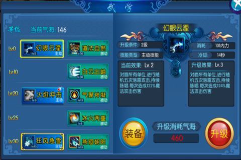 Ø 武学升级:武学可以进行升级,升级可以提升武学的效果,升级同时也需要气海值,武学等级越高需求的主角等级越高