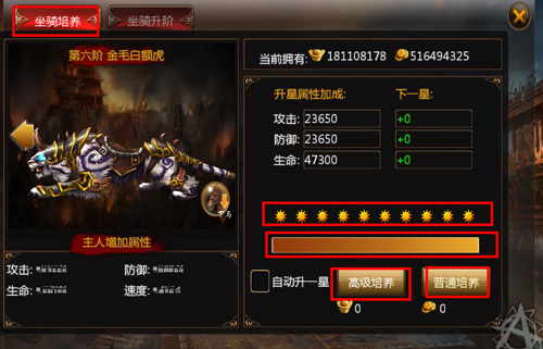 坐骑培养又分为两种方法,一种是普通培养,另一种是高级培养,普通培养是用铜钱去为坐骑升星,高级培养则是消耗元宝。每次培养之后进度条长满之后坐骑会增长一星,坐骑星级分为星星、月亮和太阳。每一种会有10级,星星长到10级之后再培养升级为月亮,月亮长到10级之后培养为太阳。